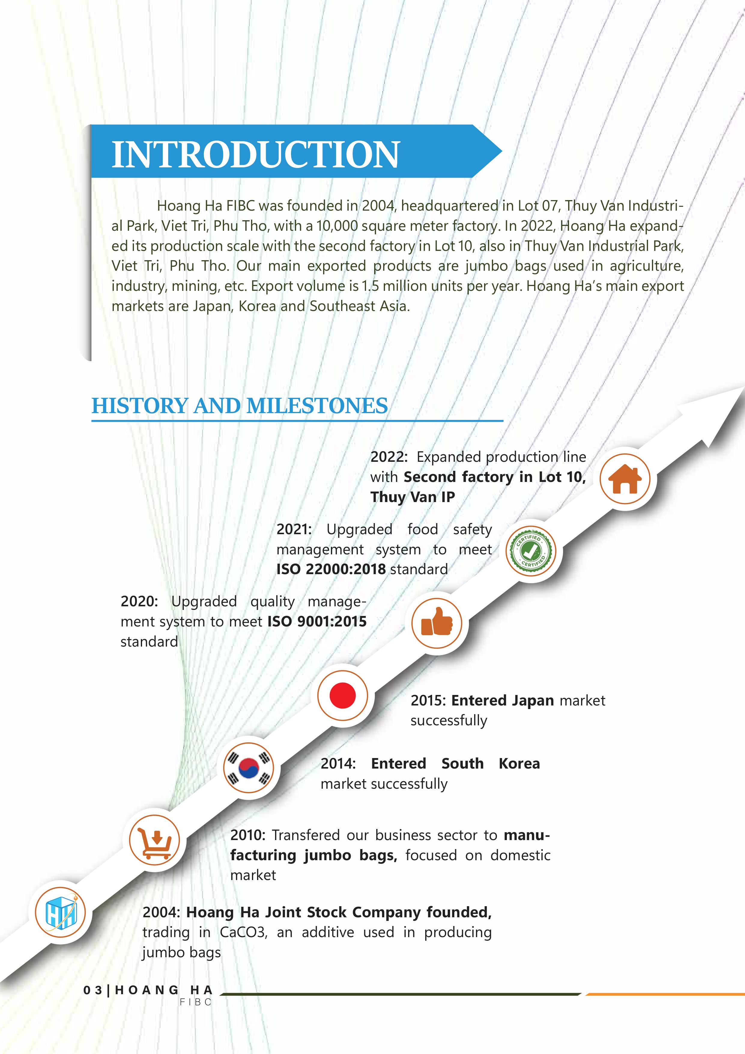 Hoang Ha Joint Stock Company was established in 2010, headquartered at Lot 07, Thuy Van Industrial Park, Viet Tri City, Phu Tho province with a factory area of 10000m2. By 2022, Hoang Ha will expand its production scale with factory No. 2 at Lot No. 10, Thuy Van Industrial Park, Viet Tri City, Phu Tho Province. With the main export products are large bags used in agriculture, industry, minerals, etc. Export output reaches 1,000,000,000 bags/year. The main export markets of Hoang Ha are currently Japan, Korea, Southeast Asia, ..